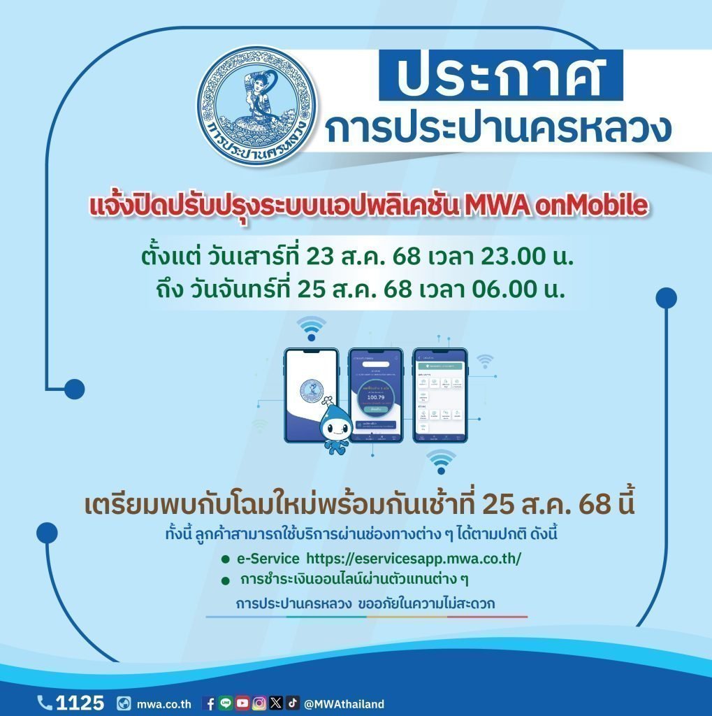 กปน. แจ้งปิดปรับปรุงระบบแอปพลิเคชัน MWA onMobile ชั่วคราว 23 – 25 ส.ค. 68 เตรียมพบกับโฉมใหม่พร้อมกันเช้า 25 ส.ค. 68 นี้