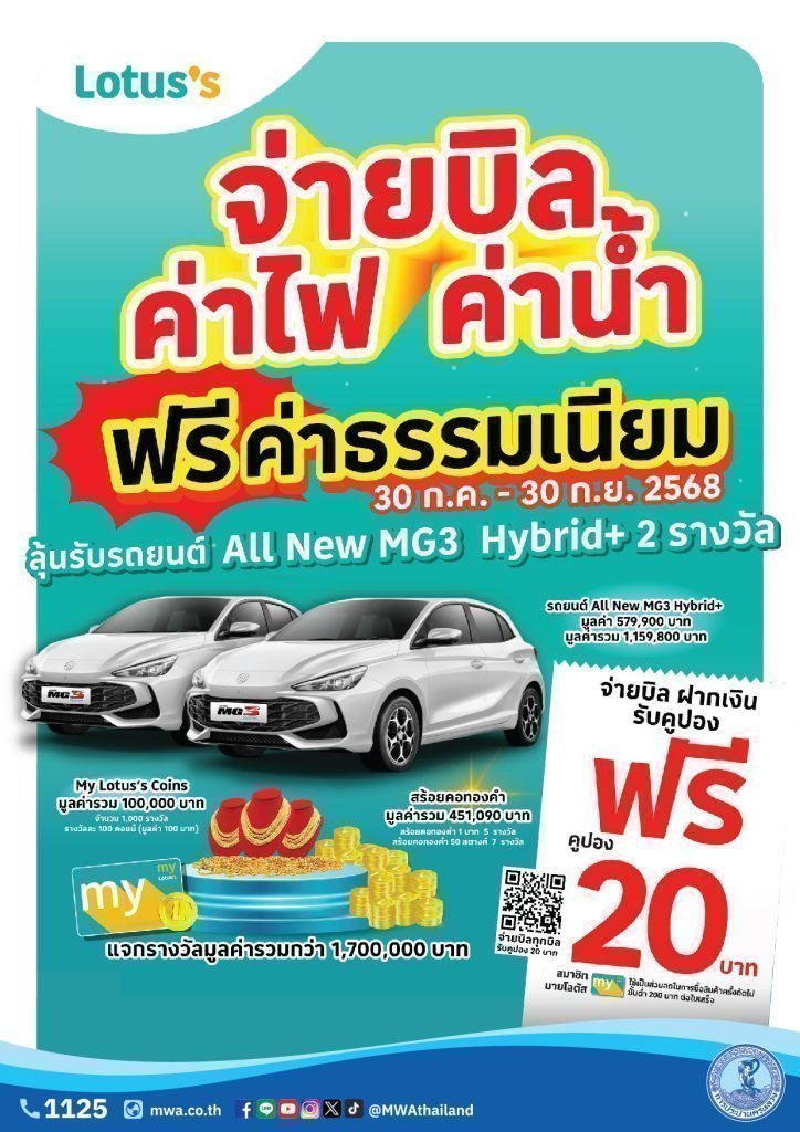 นอกจากนี้ ทุกการชำระบิลค่าน้ำประปา 1 รายการ ของสมาชิกมายโลตัส จะได้รับคูปองส่วนลดท้ายใบเสร็จ มูลค่า 20 บาท (จำกัดคูปอง 3 ใบ / สมาชิกมายโลตัส / วัน) สำหรับใช้ซื้อสินค้าของ Lotus’s ทุกสาขา ทั่วประเทศ (ยกเว้นช้อปออนไลน์) ในครั้งต่อไป (200 บาท ขึ้นไป / ใบเสร็จ / คูปอง) ตั้งแต่ บัดนี้ – 30 พฤศจิกายน 2568 พร้อมทั้งได้รับสิทธิ์ลุ้นโชค จำนวน 1,014 รางวัล มูลค่ารวมประมาณ 1,710,890 บาท (รางวัลที่ 1 รถยนต์ MG3 Hybrid+ จำนวน 2 รางวัล มูลค่ารางวัลละ 579,900 บาท รวมมูลค่า 1,159,800 บาท รางวัลที่ 2 สร้อยคอทองคำหนัก 1 บาท จำนวน 5 รางวัล มูลค่ารางวัลละ 52,950 บาท รวมมูลค่า 264,750 บาท รางวัลที่ 3 สร้อยคอทองคำหนัก 50 สตางค์ จำนวน 7 รางวัล มูลค่ารางวัลละ 26,620 บาท รวมมูลค่า 186,340 บาท รางวัลที่ 4 โลตัสคอยน์ 100 คอยน์ จำนวน 1,000 รางวัล มูลค่ารางวัลละ 100 บาท รวมมูลค่า 100,000 บาท) ประกาศรายชื่อผู้โชคดี ผ่านทางเว็บไซต์ Lotus’s ในวันที่ 16 ธันวาคม 2568 เวลา 18.00 น.
